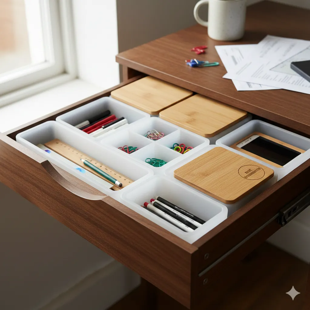 Organiser skuffer og skap med denne smarte løsningen. Justerbare skillevegger lar deg tilpasse plassen etter dine behov for maksimal organisering.